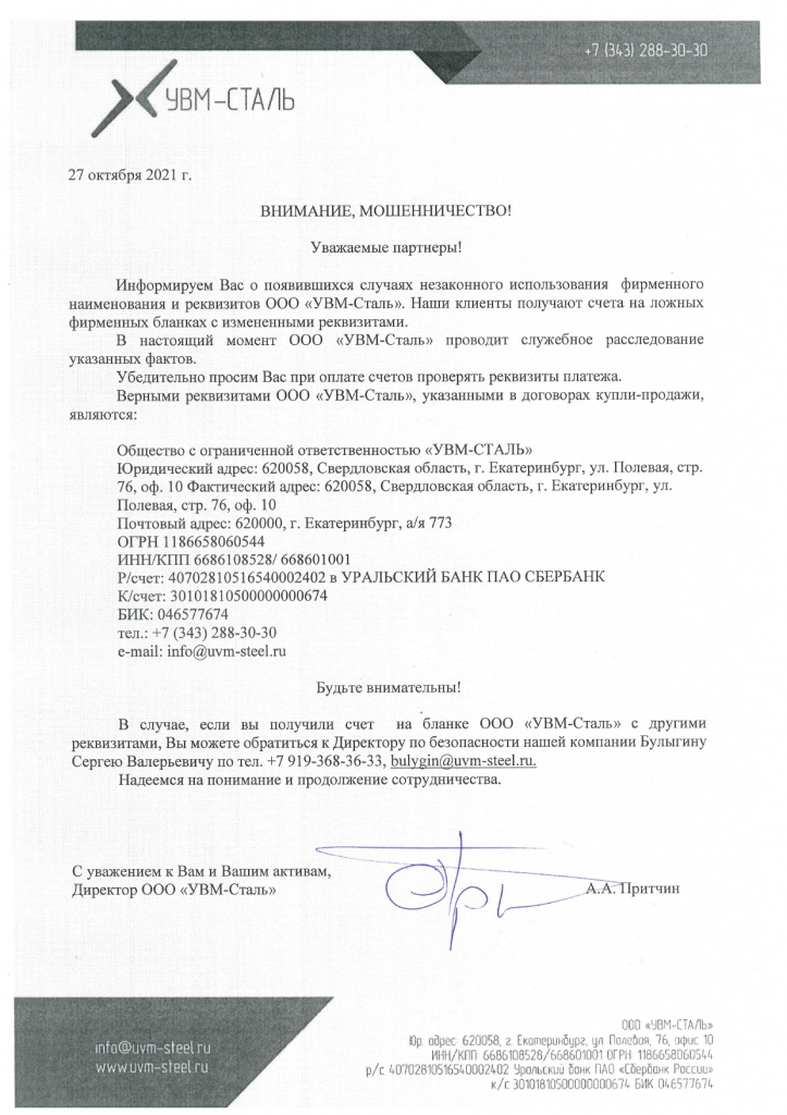 За всей подробной информацией обращайтесь к вашему менеджеру по телефону +7 (846) 229-57-69 или электронной почте kzn@uvm-steel.ru.